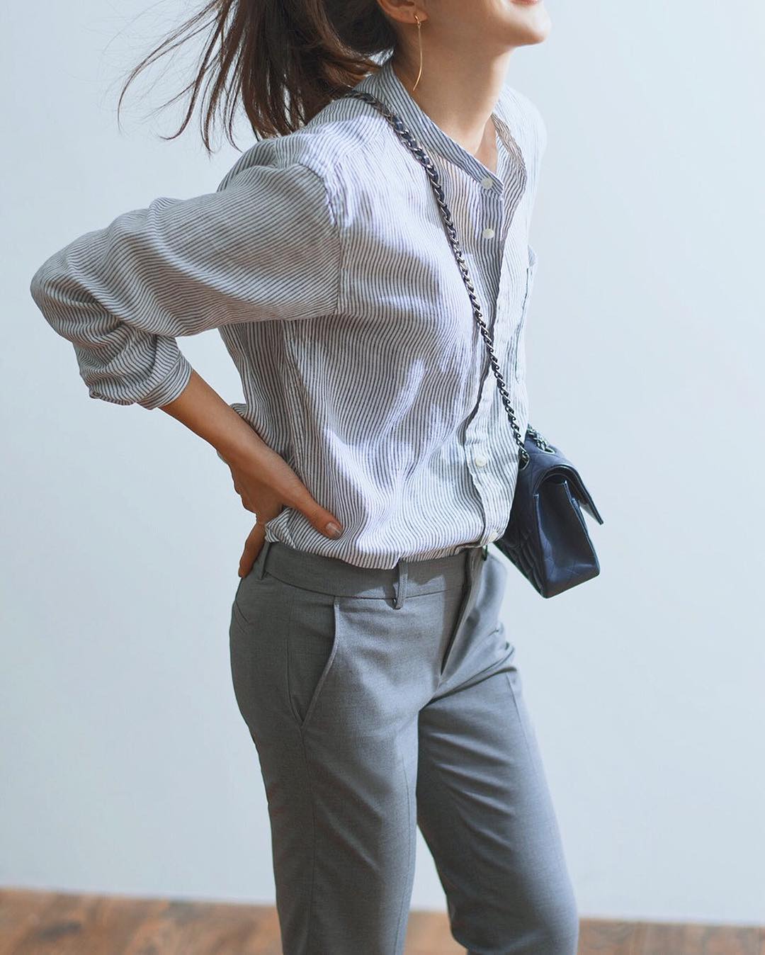 グレーのグラデーションでスッキリまとめて、さり気なく印象的なスタイリングに。