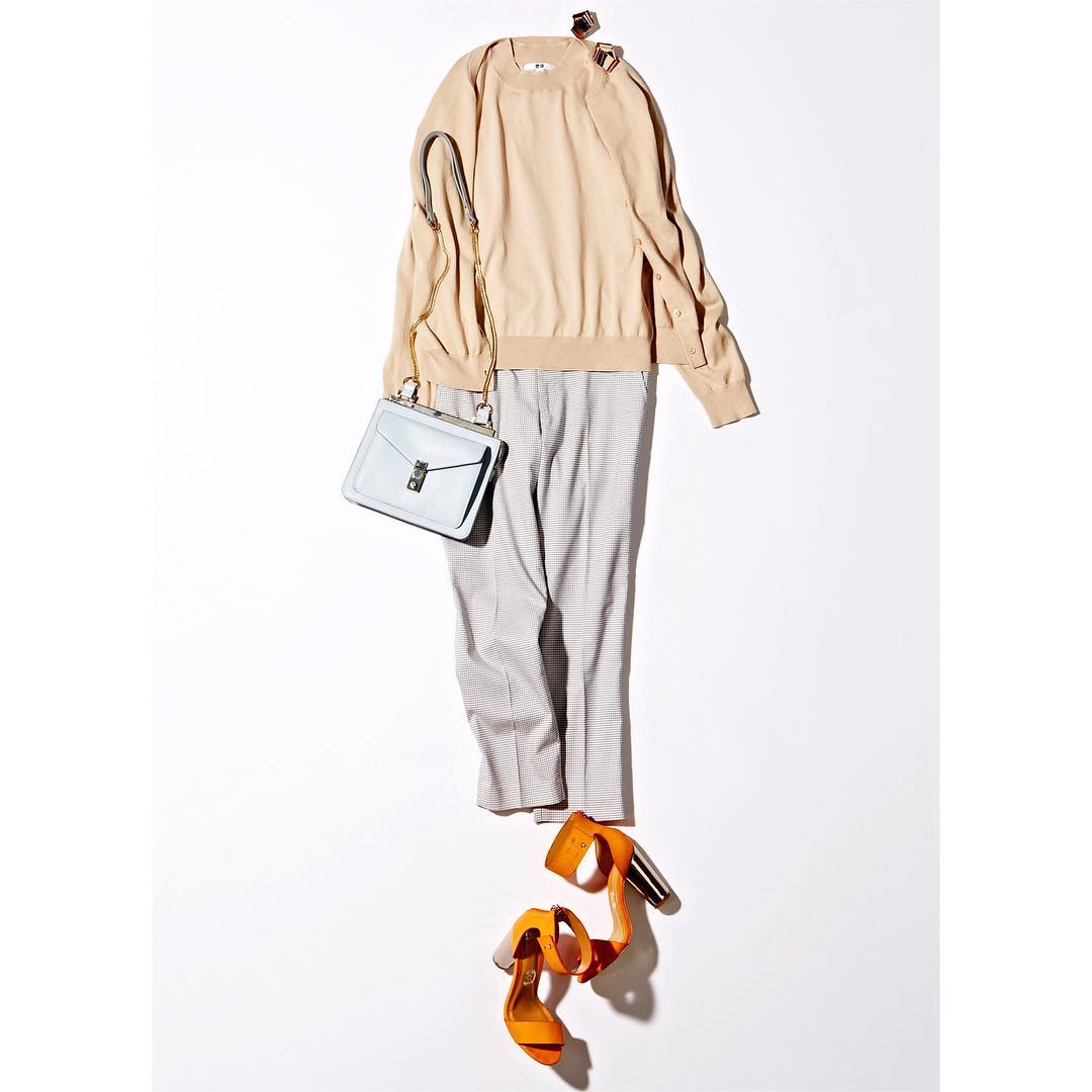 トレンドのニュートラルカラーのノースリーブニットは「ちょいハイネック」がポイント。袖なしでもきちんとした印象に見せてくれます。しかもUVカット機能つきで、これからの季節に嬉しいアイテム。