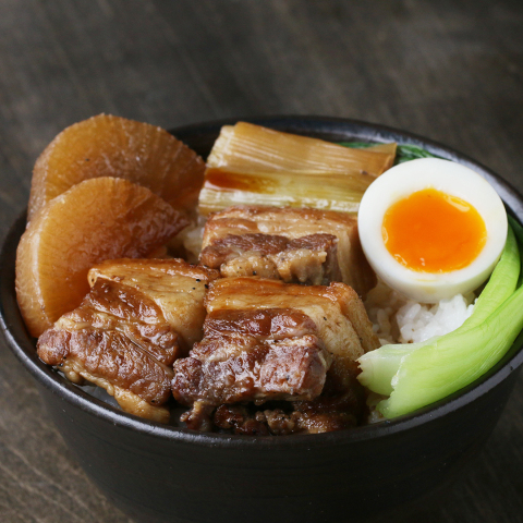 5. 丼にごはんをよそい、炊き上がった角煮をのせて、ゆで卵とちんげん菜を添える。煮汁をかけたら、完成!