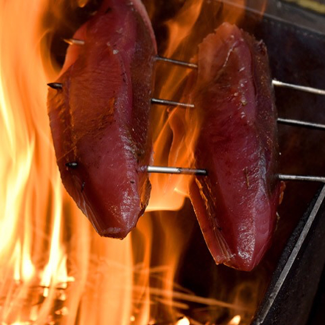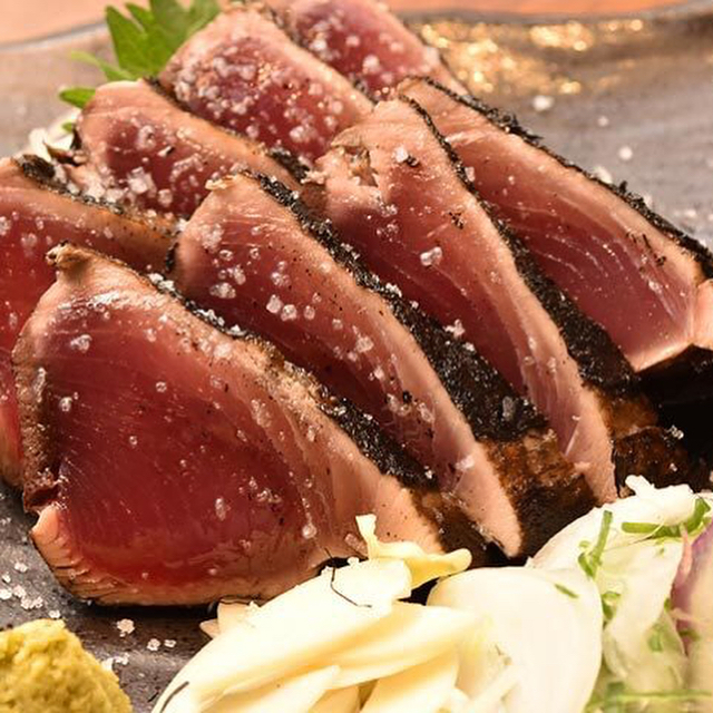 『藁焼き鰹たたき 明神丸 西新宿店』の「藁焼き鰹 塩たたき」。塩、わさび、ゆず酢、ニンニクで食す高知流の食べ方は、旨みをダイレクトに味わえる。