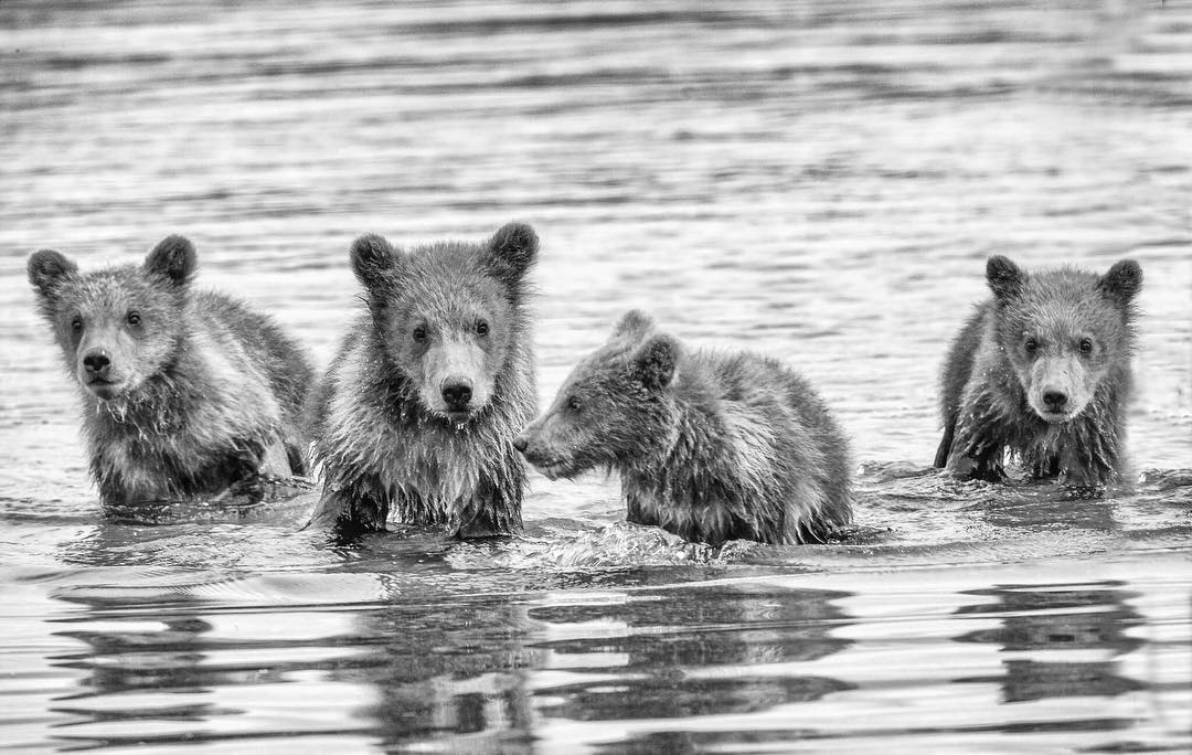“I spotted a Grizzly bear sow with 4 cubs sitting on the shore line of a lake in #Alaska. The sow decided she wanted a swim and took to the water heading along the shore to my left, parallel to the shoreline. I figured that the 4 cubs would follow mom along the shoreline in the shallow water so I grabbed my equipment (including Canon 800mm lens and heavy tripod) and ran to my left a good way (staying in the woods) to get ahead of the cubs hoping to catch them all coming towards me in the water. I got the shot I wanted and quickly exited from the scene as mom decided her swim was over and I was between her and the cubs. Love the eye contact with the largest cub second from the left.” #MyCanonStory