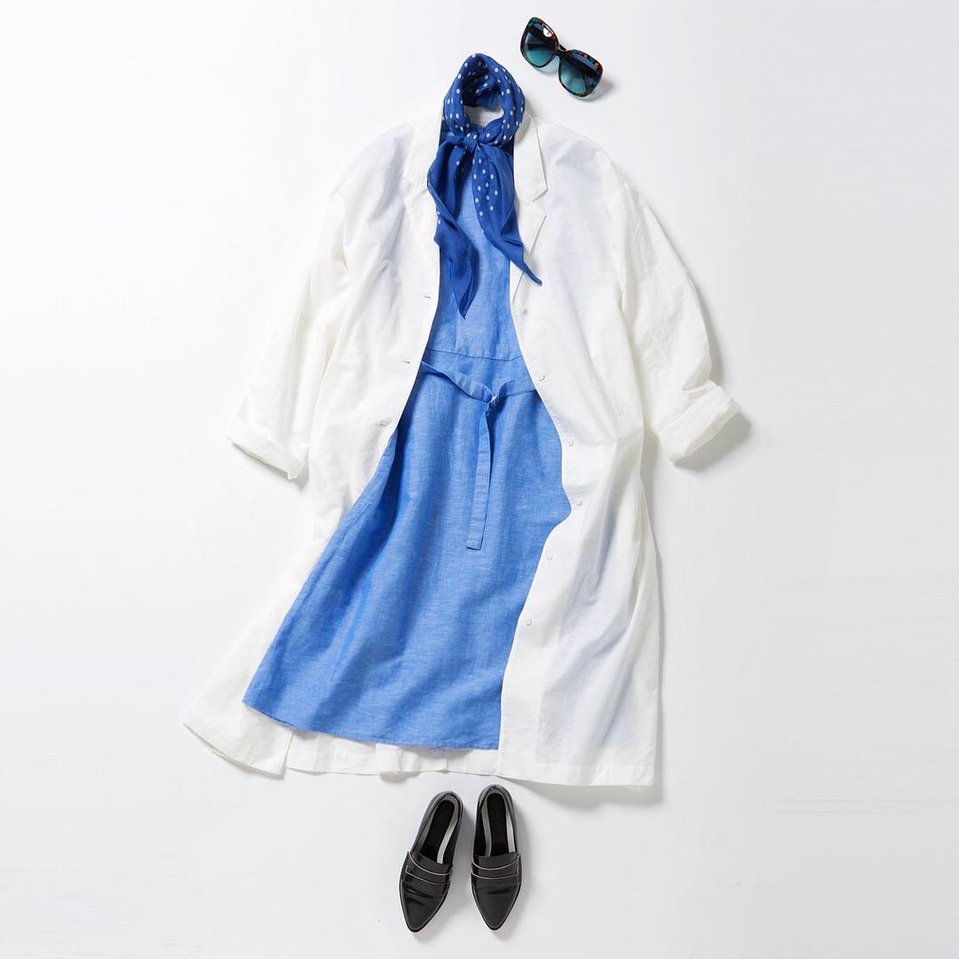 海のようなブルーと白が奏でる、フレンチシックなスタイル。リネンのワンピースとロングシャツを重ねて、どこまでも涼やかに。