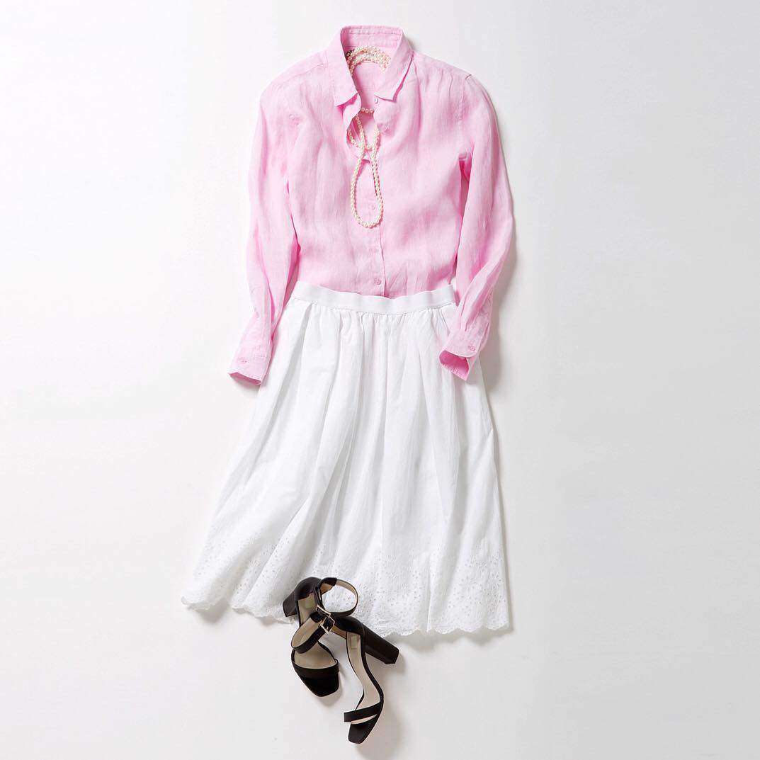 花びらのように優しいピンクで春のドレスアップを。リネンシャツとレースをあしらったスカートで、上品フェミニンに。