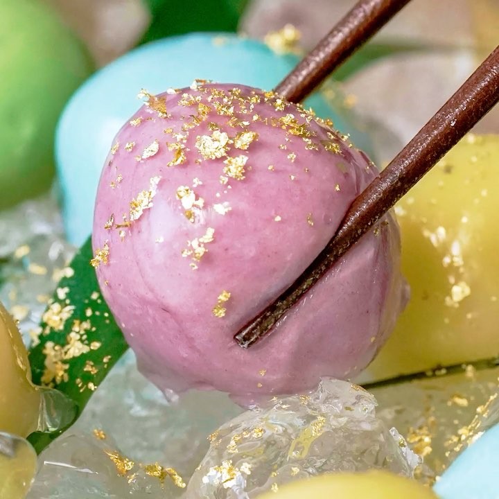 4. 粗熱が取れたら、丸めたあんこ玉に寒天液をかける⠀