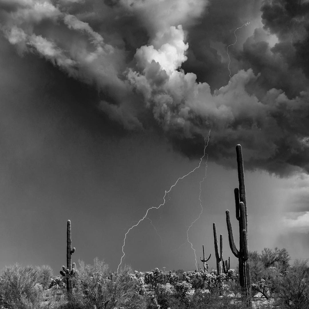 “This image was created during my monsoon chase season here in Phoenix, #Arizona. A storm was rolling through a favorite area of mine. I found a foreground in the path of the #storm as it moved right across the fields in front of me. I had my Canon EOS-1D X Mark II and my workhorse EF 28-300mm f/3.5-5.6L IS USM lens set up and awaiting a #lightning strike. I was blessed as the cloud to ground lightning landed right in between the Saguaro cactus nicely framed.” – @sklooty