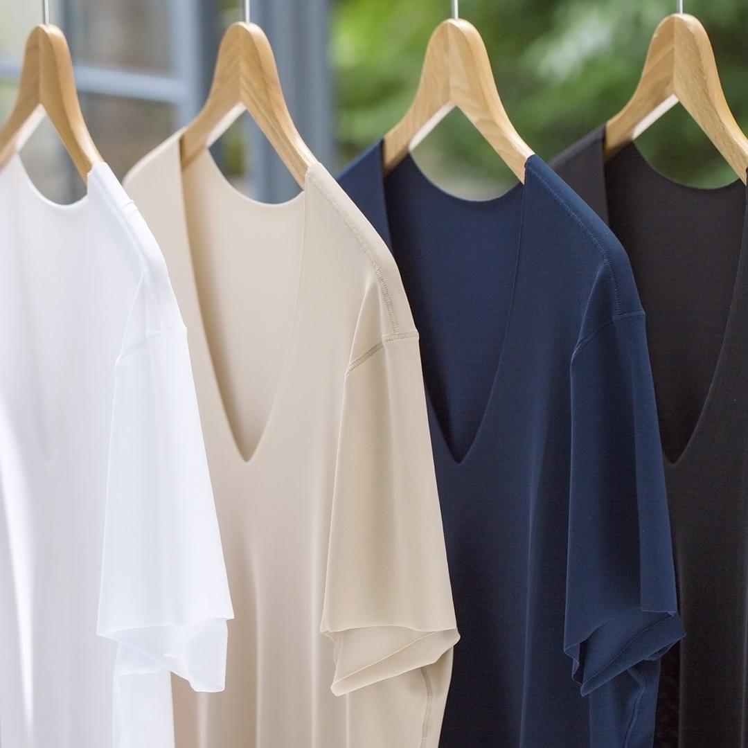 着ているのに目立たないメンズエアリズムシームレスがついに新登場!首や袖まわりの縫い目をなくしたカットオフ仕様。深めのVネックの効果で、シャツのボタンをあけても見えにくく、ベージュならさらに透けにくい。