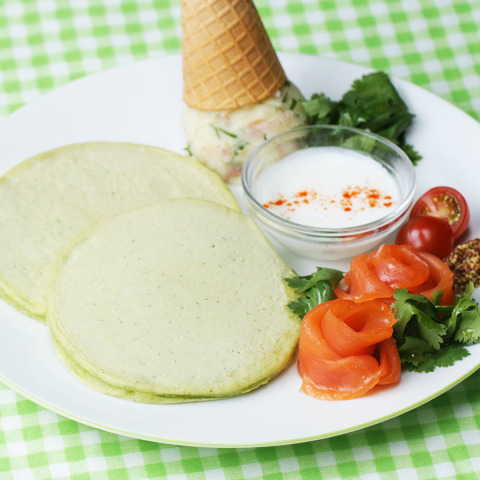 8. 皿にパンケーキを2枚のせる。パクチーポテサラをアイスクリームディッシャーで丸く成形し、アイスクリームコーンをかぶせる。(7)、パクチーの葉、ミニトマト、粒マスタードを添えたら、完成!