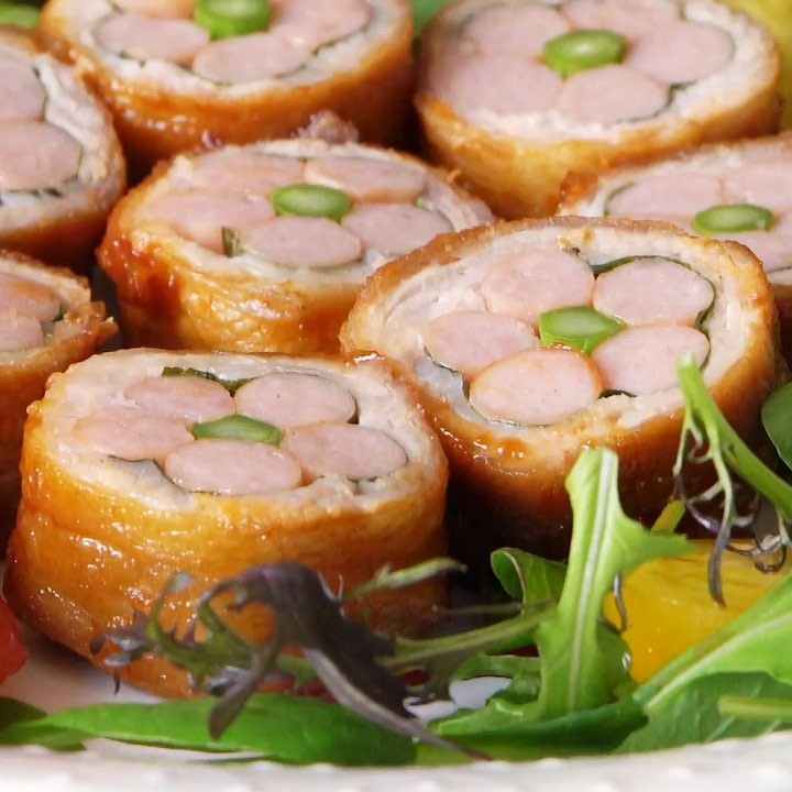 2.片側から巻き、巻き終わった後ポークビッツの中央の空洞部分に同じ長さに切ったアスパラを差し込む。⠀⠀