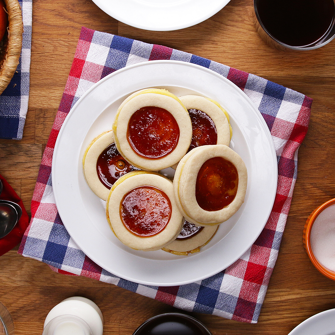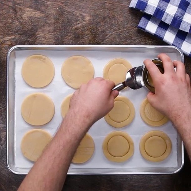 13. クッキーが冷めたら円形のクッキーにカスタードクリームを絞り出し、リング状のクッキーをカスタードが乗ったクッキーの上にかぶせる。
