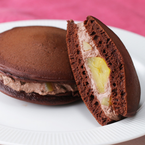 6.どら焼きの皮を2枚1組にし、マロンクリームと栗を挟んだら、完成!