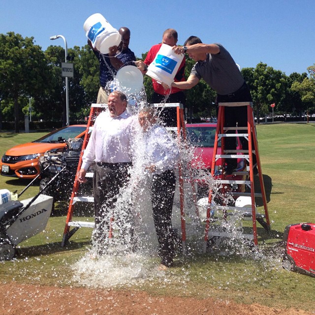 President of Honda North America Takuji Yamada and EVP of Automobile Sales Division of American Honda John Mendel donate money to help the cause and get drenched in the #ALSIceBucketChallenge. Added bonus: helping water the softball fields at American Honda’s HQ.