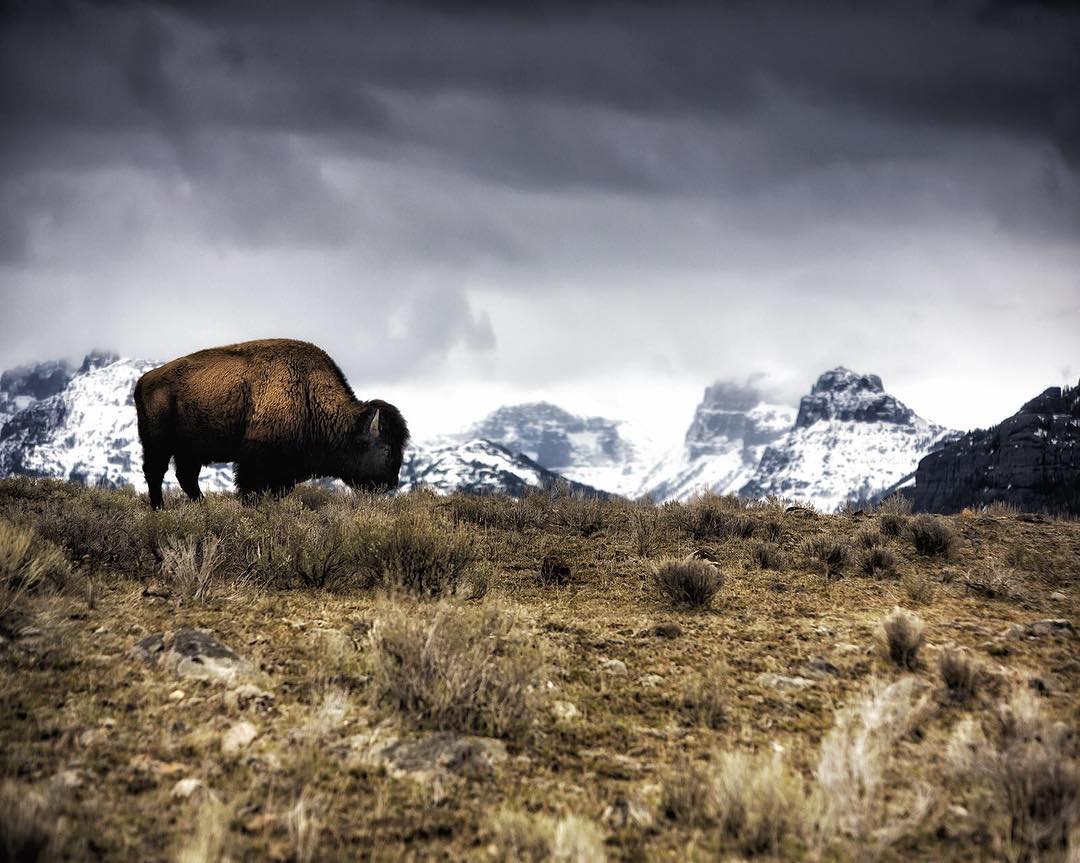 “A lone #buffalo grazes under dramatic skies in the Lamar Valley of #Yellowstone National Park.” #MyCanonStory