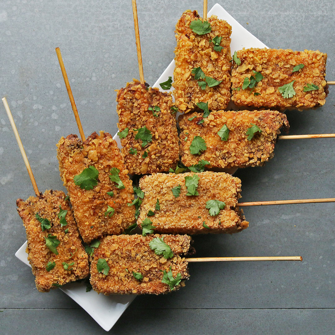 8. (7)に薄力粉をまぶして余分な粉は払う。溶き卵にくぐらせて、砕いたコーンチップスをまぶしたら、170℃の揚げ油で2本ずつ、8分ほど揚げる。きつね色に揚がったら紙などに取って油を切る。