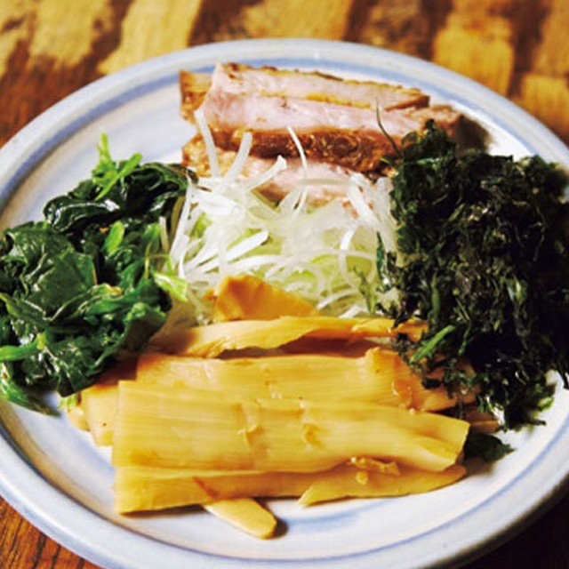 『和風ラーメン だるまや』の「たかなそば」は、別盛りでくるので自分好みの食べ方で楽しめる。写真の「だるまそば そばの具」など、各そばの具だけも注文可能。