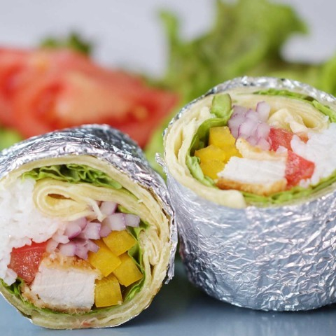 8. トルティーヤにサニーレタス、キャベツ、ご飯、とんかつ、パプリカ、トマト、紫玉ねぎをのせ、とんかつソースをかける。