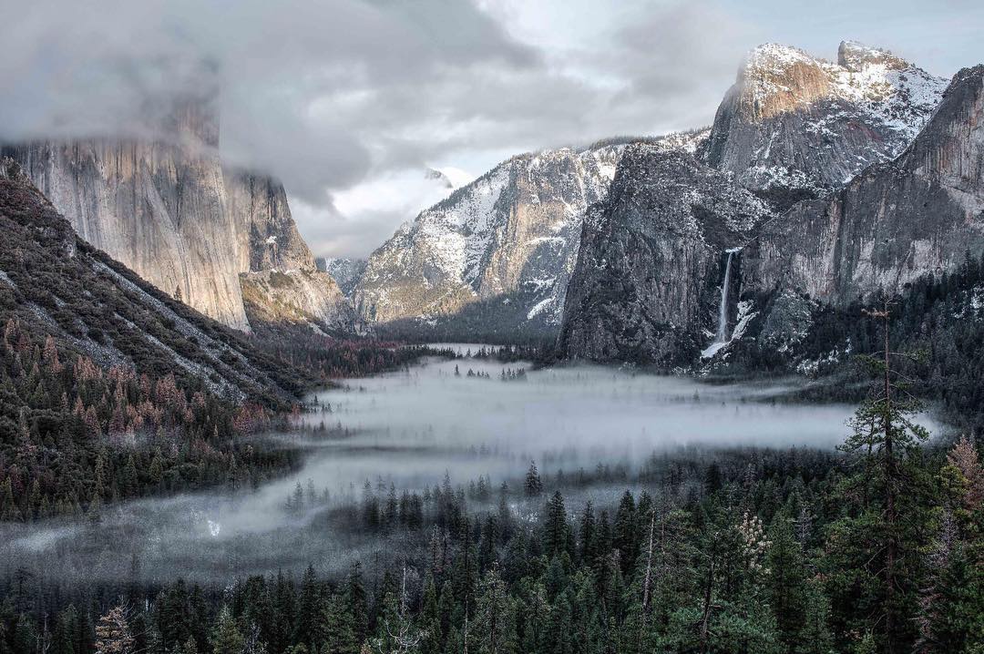 “Tunnel view. Mega classic photo spot. It’s a rare treat to watch a storm clear in the valley from this spot. Nature’s dynamism on full display. For this shot, I spent about 2 hours taking photos with different perspectives, waiting for the right feeling in the light and the fog in the valley foreground. Having the fog fully in frame in the bottom left corner was very important for this image. For editing, I combined three different EV stops via HDR software. The trick here is to not over-edit. It’s very easy to get carried away with HDR software. A good edit looks almost like no edit at all.” – Photo by @tedhesser