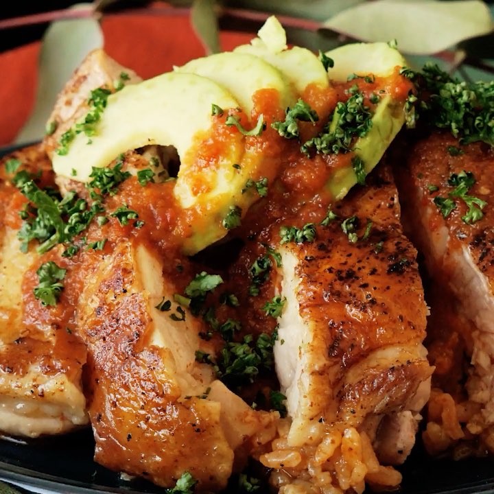 6.鶏肉を取り出しご飯を皿に盛る。食べやすい大きさに切った鶏肉、1cm幅に切ったアボカドをのせ、パセリ、ハバネーロソースをかける。⠀