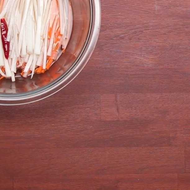 1. 鍋にピクルス液の材料を入れて沸騰させる。砂糖が溶け、ワインのアルコール分がとんだら火からおろし、千切りにした大根と人参にかけて馴染ませ、冷ます。