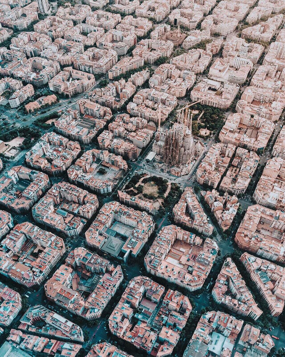 Barcelona has a strict grid pattern, crossed by wide avenues, designed in the 19th Century. This visionary design by Spanish urban planner Ildefons Cerdà, considered traffic and transport along with sunlight and ventilation in coming up with his characteristic octagonal blocks! ♺