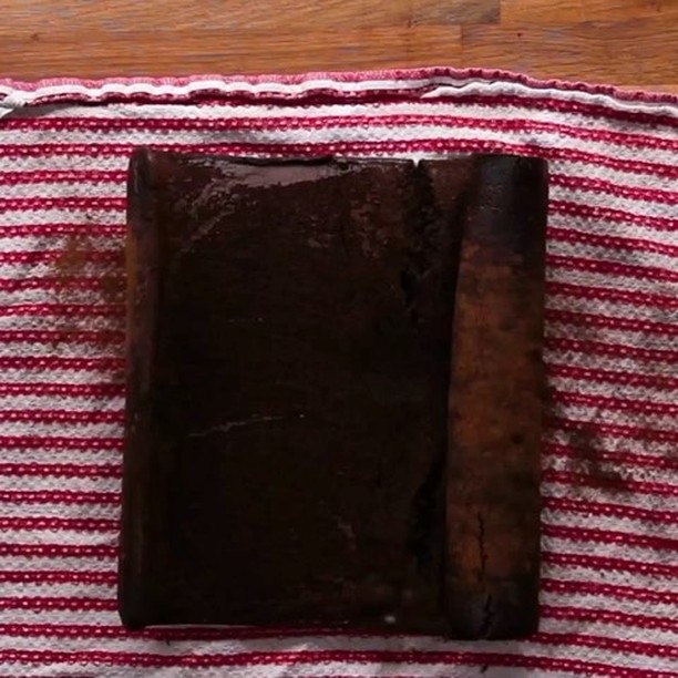 5. 清潔なタオルにココアパウダー(分量外)をまぶし、焼きあがったロール生地をのせる。クッキングシートをはがしたら端からタオルごと巻いていき、冷蔵庫に入れて冷やす(約1時間)。