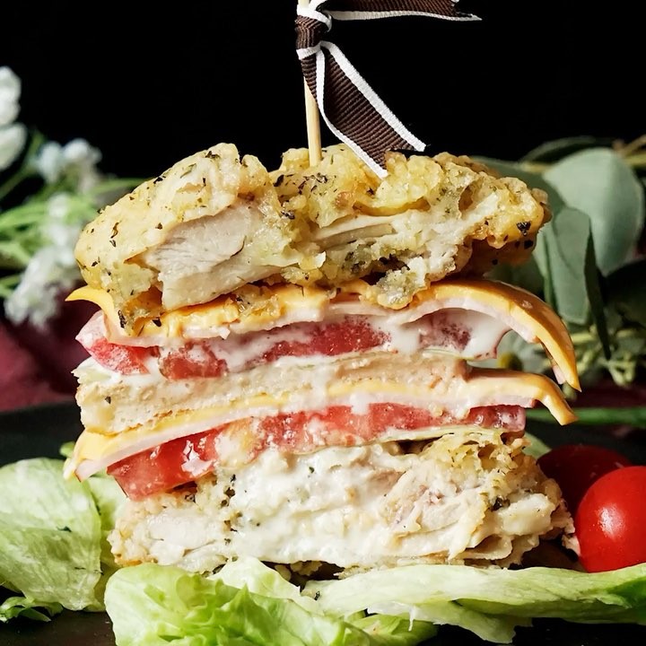 4. 具材を鶏肉で挟むように重ねたら完成。⠀