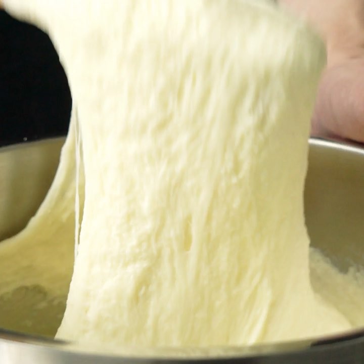2. シュレッドチーズ600gを二回に分けて振り入れて、弱火で混ぜる。⠀