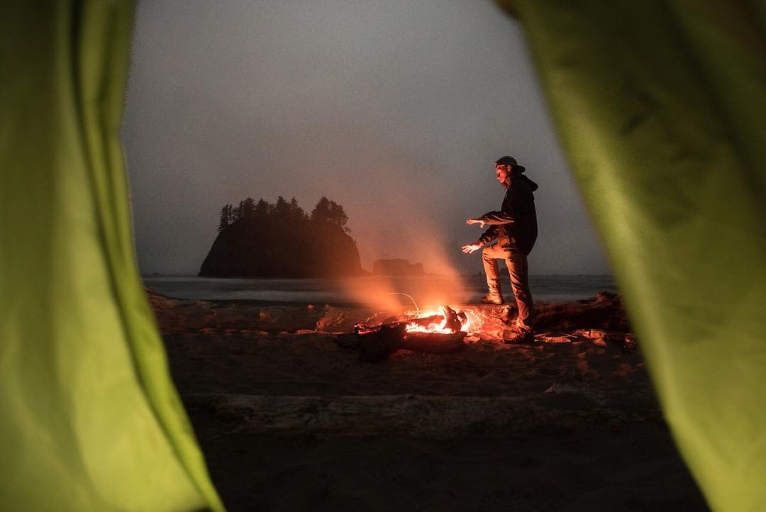 @the_outbound_life continuing our takeover! This still was captured on La Push Beach in Washington. After a long day of hiking and exploring, we were all beyond exhausted and ready to crash. As I was preparing my sleeping bag, I looked up for a moment and noticed how the sides of the my tent were almost perfectly framing the fire that my brother Kody was huddled around. I find that so many of my favorite images are birthed from pushing just a little bit further to get the shot. This is also probably the reason that we will always be catching up on sleep ;P