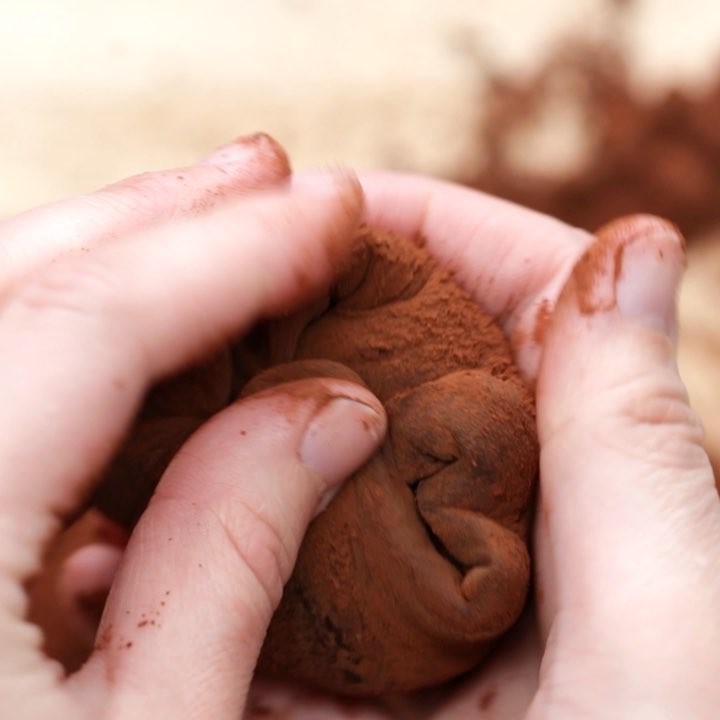 6. 求肥を熱いうちに丸く広げ、(3)を包んだら、完成!仕上げにココアパウダーをふりかける。