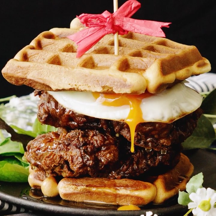 【アメリカンな朝食はいかが?】ワッフルサンドメープルチキン🍴⠀