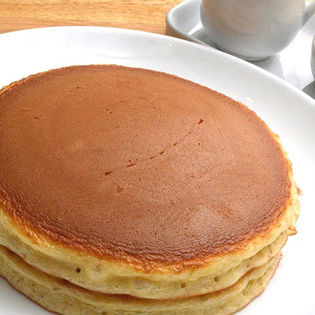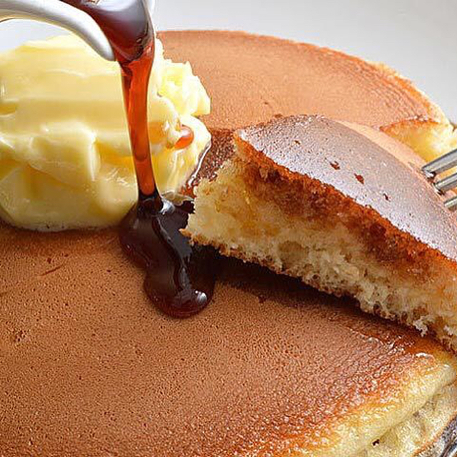 『ホットケーキパーラーFru-Full(フルフル)』の、ホットケーキ。上質な小麦、通常よりも多めに使用する卵など、生地の配合は万惣の味を継承している。