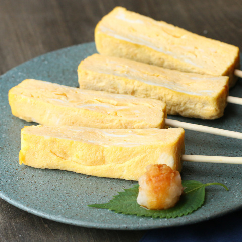 3. 卵焼きが焼き上がったら縦半分に切る。串を刺したら、完成!しょうゆをかけた大根おろしと一緒にいただく。