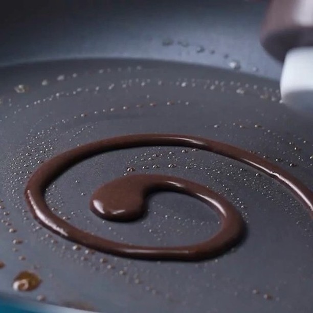 5. フライパンにバターを熱し、ココア生地でうずまきを描いたら30秒ほど待つ。