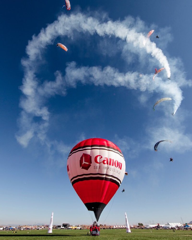 Look who stopped by the #BalloonFiesta! Our friends @parabatix zoomed past our balloon before perfoming their incredible acrobatic show! #parabatix Photo credit @garnierlouis_photographer using a Canon EOS 1D MK IV & a Canon EF 11-24mm f/4L USM lens.