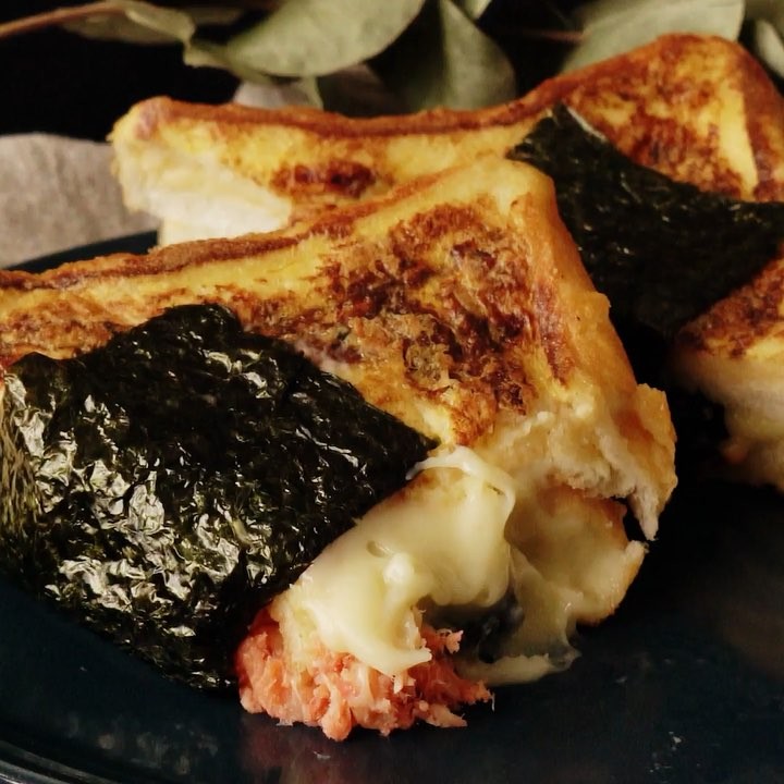 1. 食パンにからしマヨネーズを塗り、のり、ほぐしシャケ、とけるチーズ、食パンを重ねる。⠀
