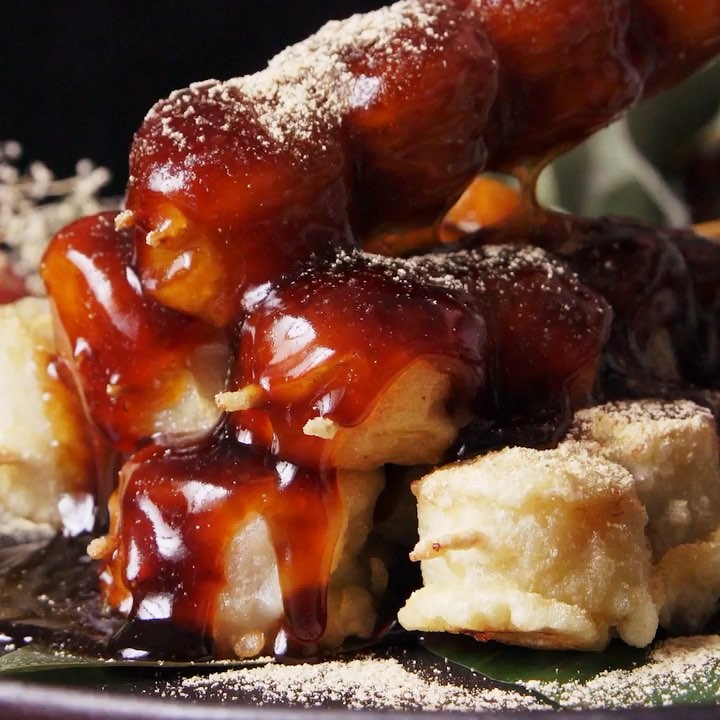 5. 揚げたバナナ天ぷらにみたらしあんをかけ、お好みできな粉を振るい完成!⠀