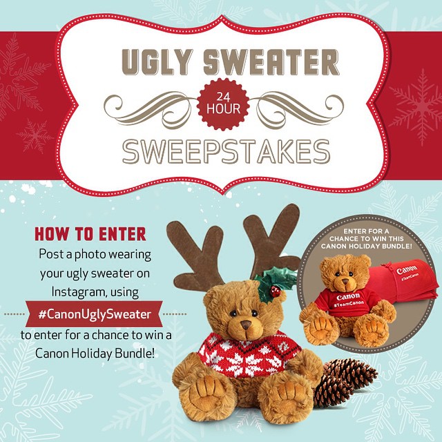 NO PURCHASE NECESSARY TO ENTER OR WIN. Open only to residents of the 50 United States and the District of Columbia, 13 and older. Void outside U.S. and where prohibited or restricted by law. To enter, post an ugly sweater photo on Instagram using the hashtag #CanonUglySweater during the Sweepstakes Period. The Sweepstakes Period starts at 12:00 A.M. ET on December 12, 2014 and ends at 11:59 pm ET on December 12, 2014. Limited to one (1) entry per person per Instagram handle during the Sweepstakes Period. Twenty Five Winners will be selected by random drawing to receive One (1) #TeamCanon Teddy Bear (MSRP: $9.99) and One (1) #TeamCanon Blanket (MSRP: $29.99). By entering, you represent and warrant that you own all right and title in the photo and the photo does not violate the intellectual property rights or publicity rights of a third party. By entering, you release Sponsor and Instagram from any liability associated with participating in the Sweepstakes and/or accepting any prize. Winner grants Sponsor the right to use name and likeness for promotional purposes. Sponsor: Canon U.S.A., Inc., One Canon Park, Melville, NY 11747. Please visit the following link http://usa.canon.com/canonuglysweater for the full Official Rules.