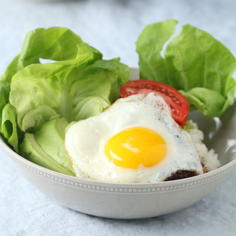 4.丼にご飯をよそい、レタス、トマト、アボカドをのせる。(3)のハンバーグをのせてソースをかけ、目玉焼きをのせたら、完成!