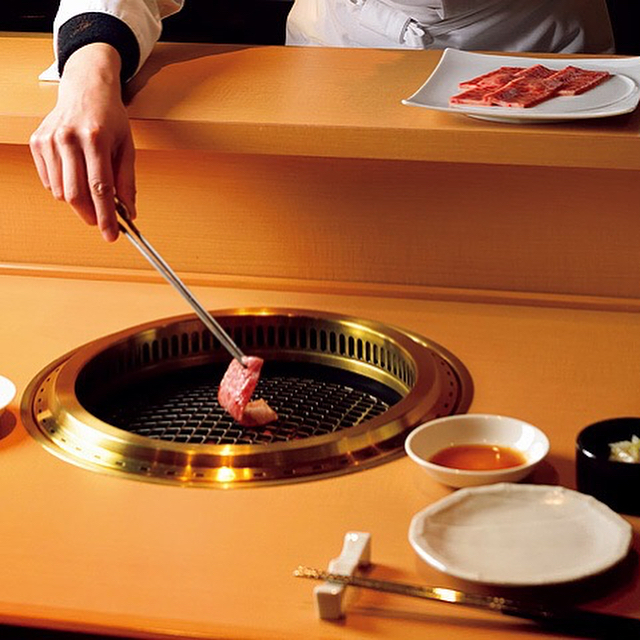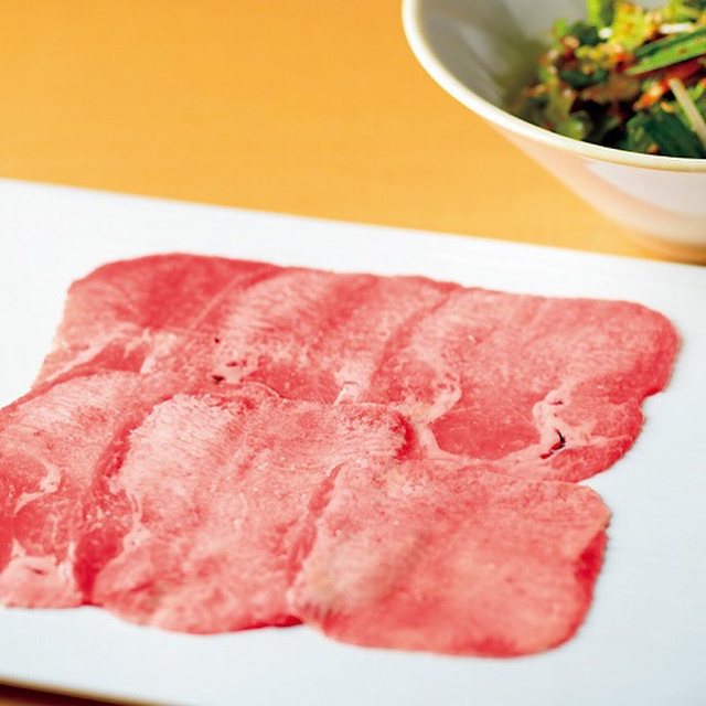 『韓国焼肉 田無羅 麻布十番』では、肉焼きはお任せスタイル。完璧なる大人の焼肉を楽しめる。写真は、おまかせコース¥15,000からの一品、特選和牛の塩タン(2人前)。