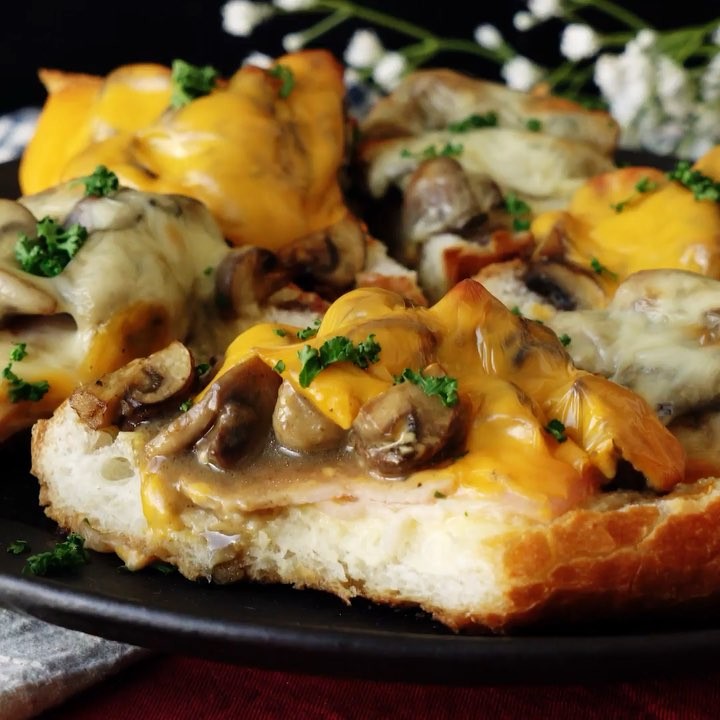 3.フランスパンを6等分に切り、ニンニク、マヨネーズを薄く塗る。ロースハム、2をのせる。溶けるチーズをのせ、200℃に予熱したオーブンで約10分焼く。⠀