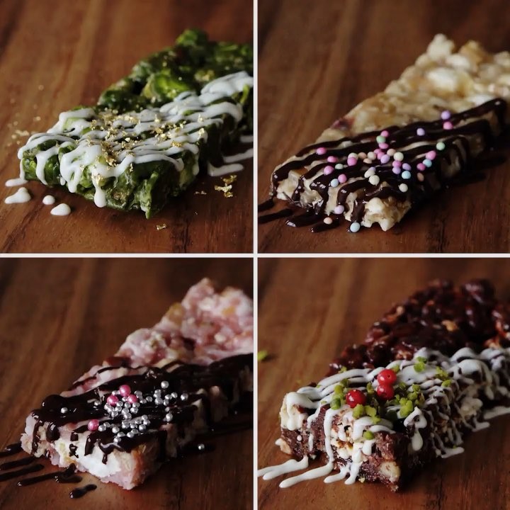 2. 別のフライパンでバター、マシュマロ、チョコレートを入れて混ぜながら溶かす。(抹茶やストロベリーパウダーはここで入れる)⠀