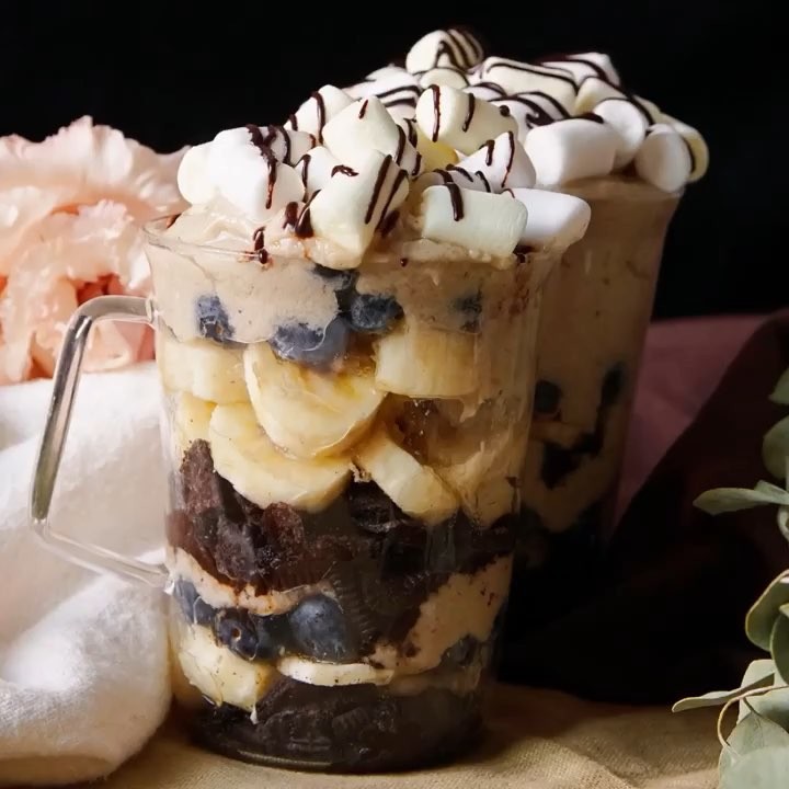 4. ガラスの器に砕いたオレオ、バナナ、ブルーベリー、バナナクリームが層になるように2回重ね、一番上にマシュマロを乗せる。⠀