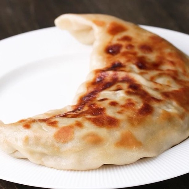 4. 伸ばした生地のふち半分に水を塗り、(2)を中央にのせて、ひだを作って閉じる。