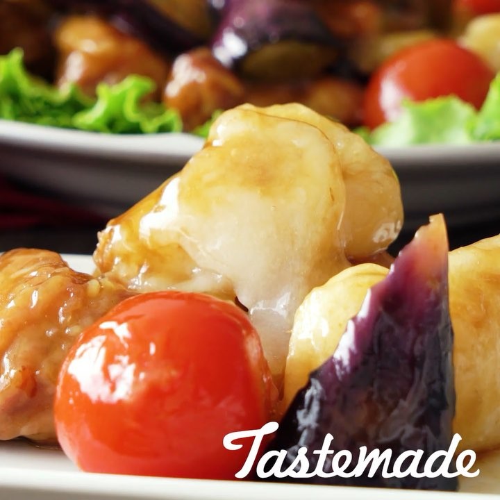5. 揚げたお餅と唐揚げとなすとプチトマトを黒酢あんに絡める⠀