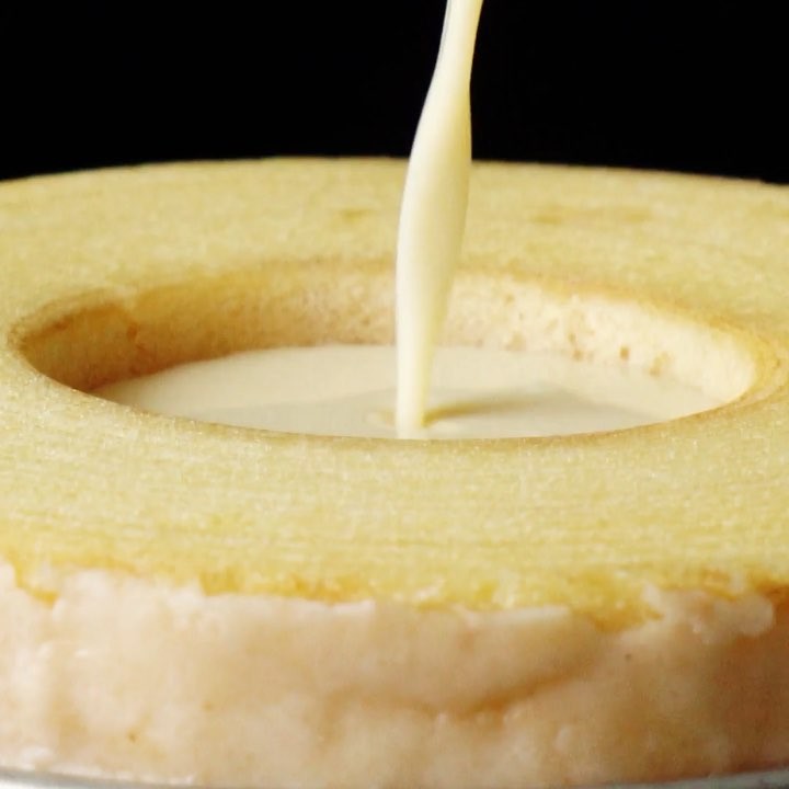3.型に入れたバームクーヘンの穴にプリン生地を流し込み、冷蔵庫で冷やし固める(60分〜)⠀⠀