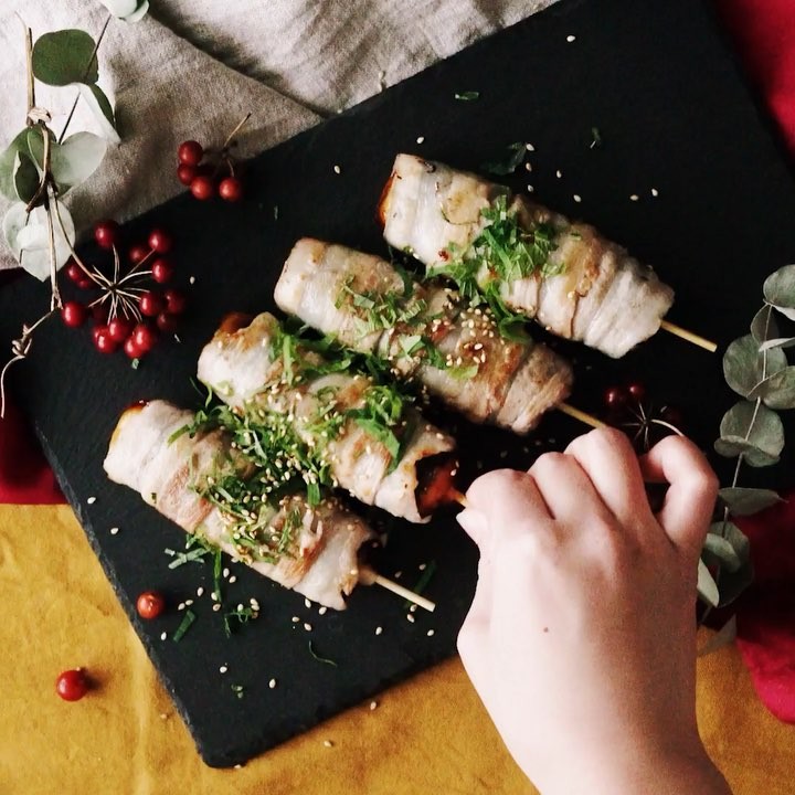 1. 並べた豚バラスライスに塩胡椒をし、のりと大葉を乗せその上からみたらし団子を置いて巻く。⠀