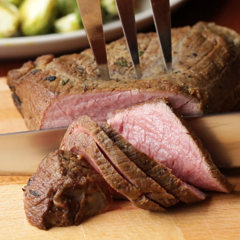 1.牛肉は冷蔵庫から出して30分程度置き、常温に戻す。オリーブオイルを表面にぬり、にんにくをすりこむ。塩、コショウ、ローズマリーをまんべんなくまぶす。