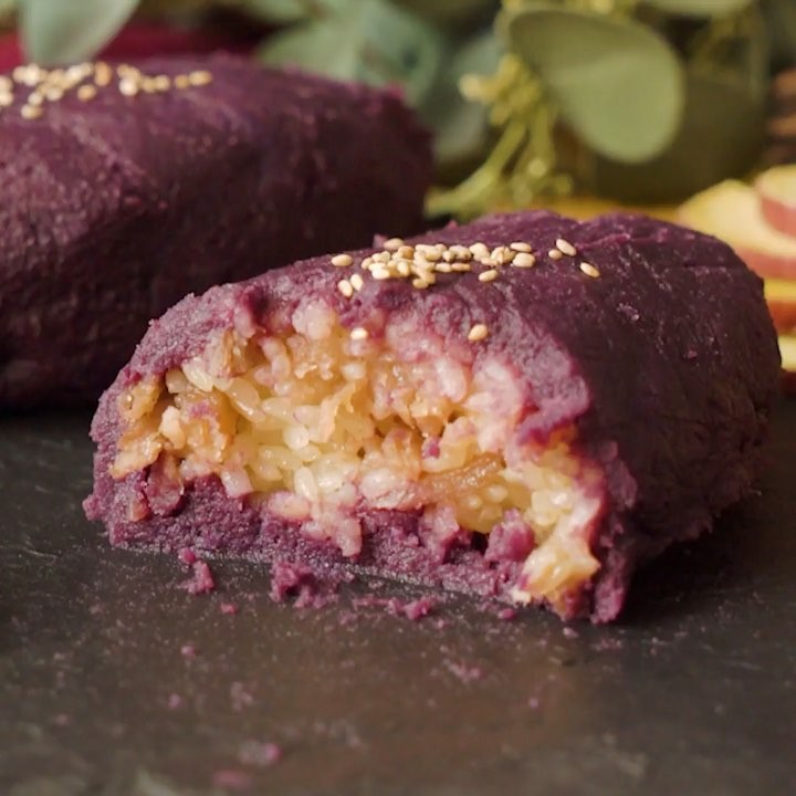 2. ラップの上に紫芋のペーストをのせ、炊いたご飯を包んだら両端を縛り、形を整える。⠀