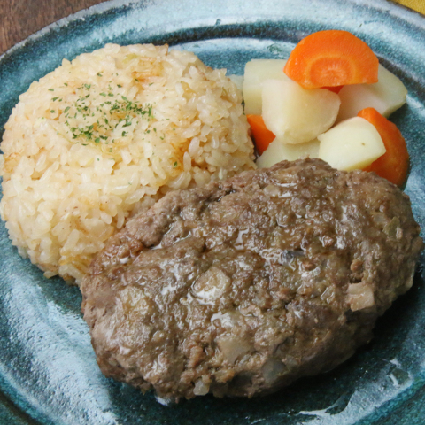 7.ガーリックライス、蒸し野菜、れんこんハンバーグを器に盛り付ける。れんこんハンバーグにてりやきソースをかけたら、完成!