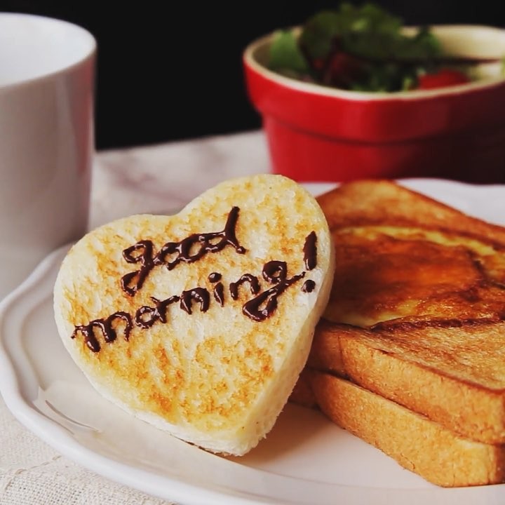 4. 卵がある程度焼き固まったらひっくり返して弱火にし、その上にとろけるチー ズ、クリームコロッケを置いて、もう一枚の食パンを被せる。ヘラなどを使って上 からパンを押し、じっくりプレスしながら焼いていく。良い焼き色が付いたらひっ くり返し、もう片面も焼き色を付ける。お皿に取り、食べやすい大きさにカットし て完成! ※くり抜いて余った食パンは軽くトーストし、チョコペンで文字を書いて添えると 可愛いです!⠀
