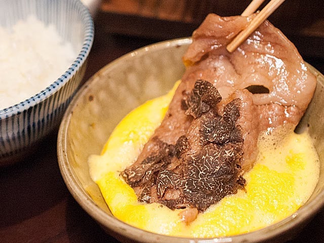 『東麻布 不風流』の名物「トリュフがけ和牛 すき焼き」は、ほどよく焼かれた和牛の上にトリュフをかけたら、ふわふわに仕上げた卵に漬けて召し上がれ。
